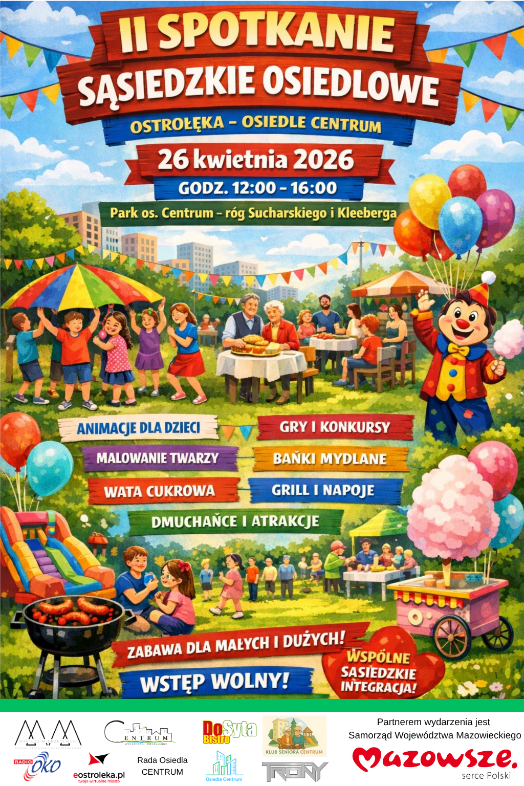 II Spotkanie Sąsiedzkie Osiedla Centrum to inicjatywa skierowana do wszystkich mieszkańców, którzy chcą wspólnie spędzić czas, lepiej się poznać i skorzystać z licznych atrakcji przygotowanych dla dzieci i dorosłych. Organizatorzy zapraszają na popołudnie pełne zabawy, muzyki i dobrego jedzenia w przyjaznej, sąsiedzkiej atmosferze.